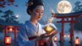 Luxurious Japanese folding fan with blue and white design, surrounded by cherry blossoms and mystical mist, symbolizing salt taio and yokai folklore. 雑学・科学・コラム