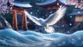 桜舞う日本の古刹で、神秘の青い光をまとったお地蔵様と塩供え。浄化と守護の信仰を象徴する一場面。